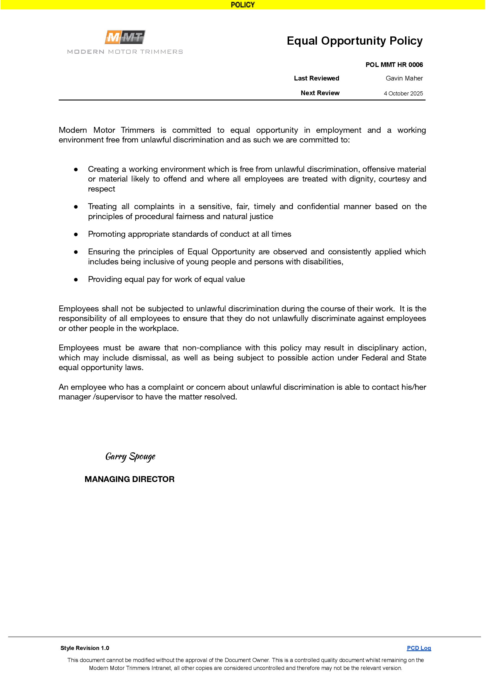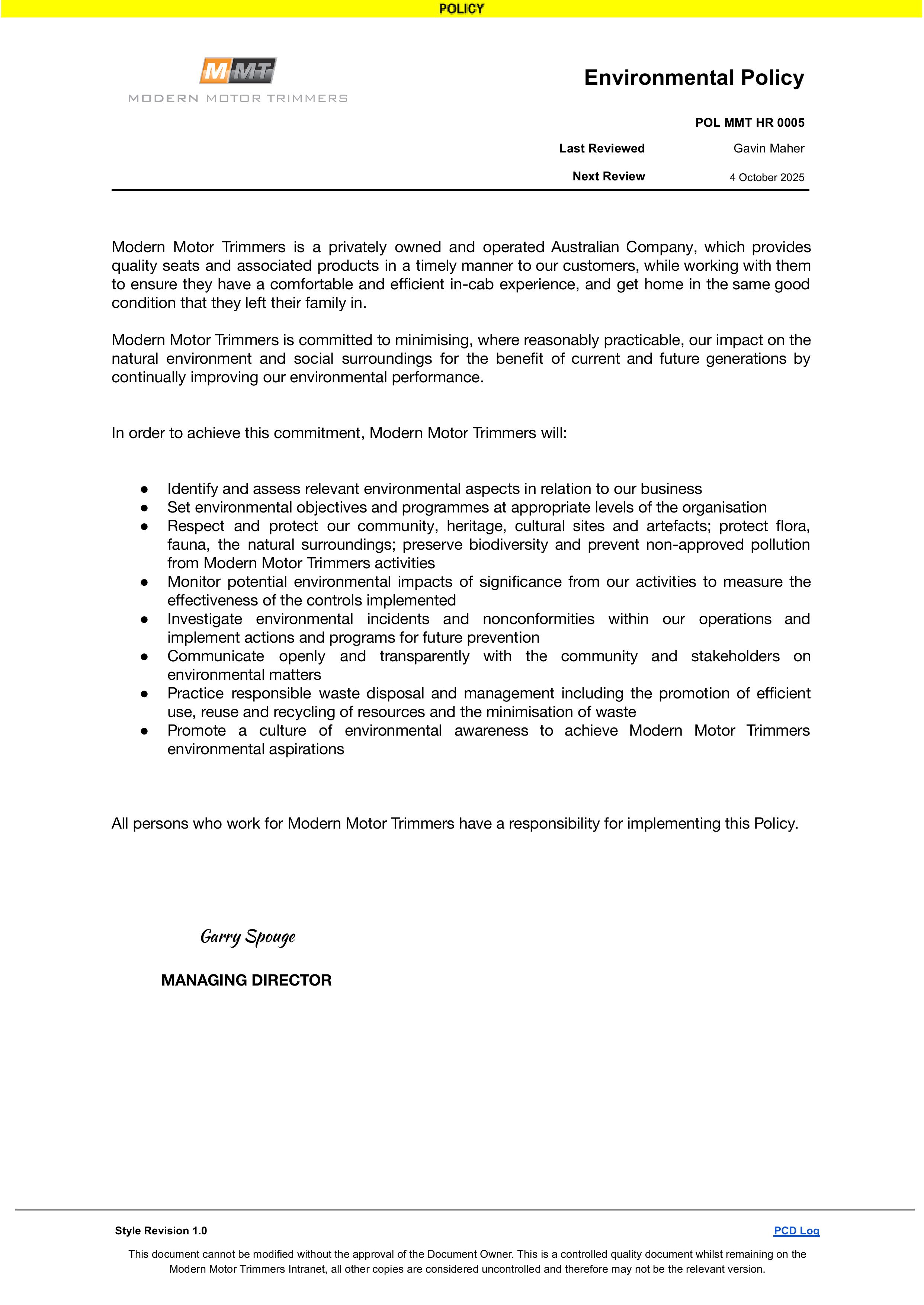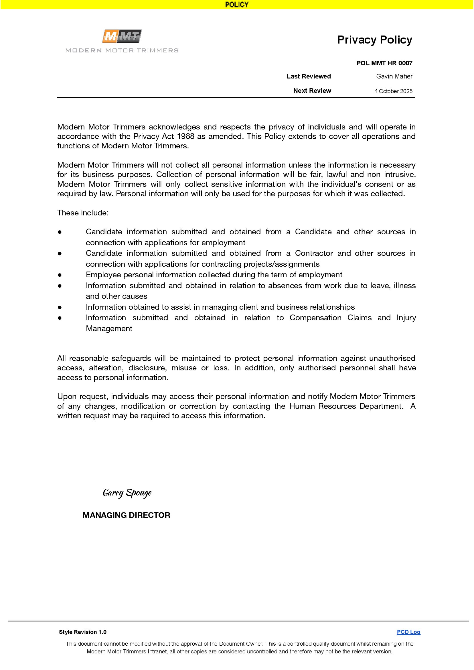 "It is critical to frame these policies to reflect our values and company mission." - Garry Spouge